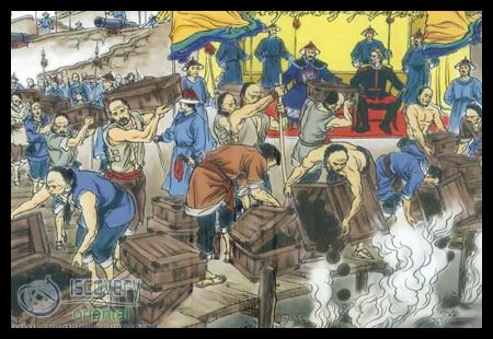 Commissioner Lin Zexu destroying opium outside of Humen Town (虎门销烟). [chinesegeography.skyrock.com]